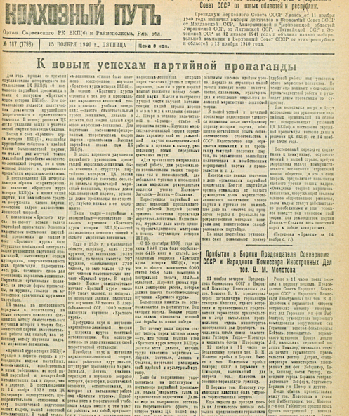 Колхозный путь (Сараи), № 187, 15 ноября 1940г.
