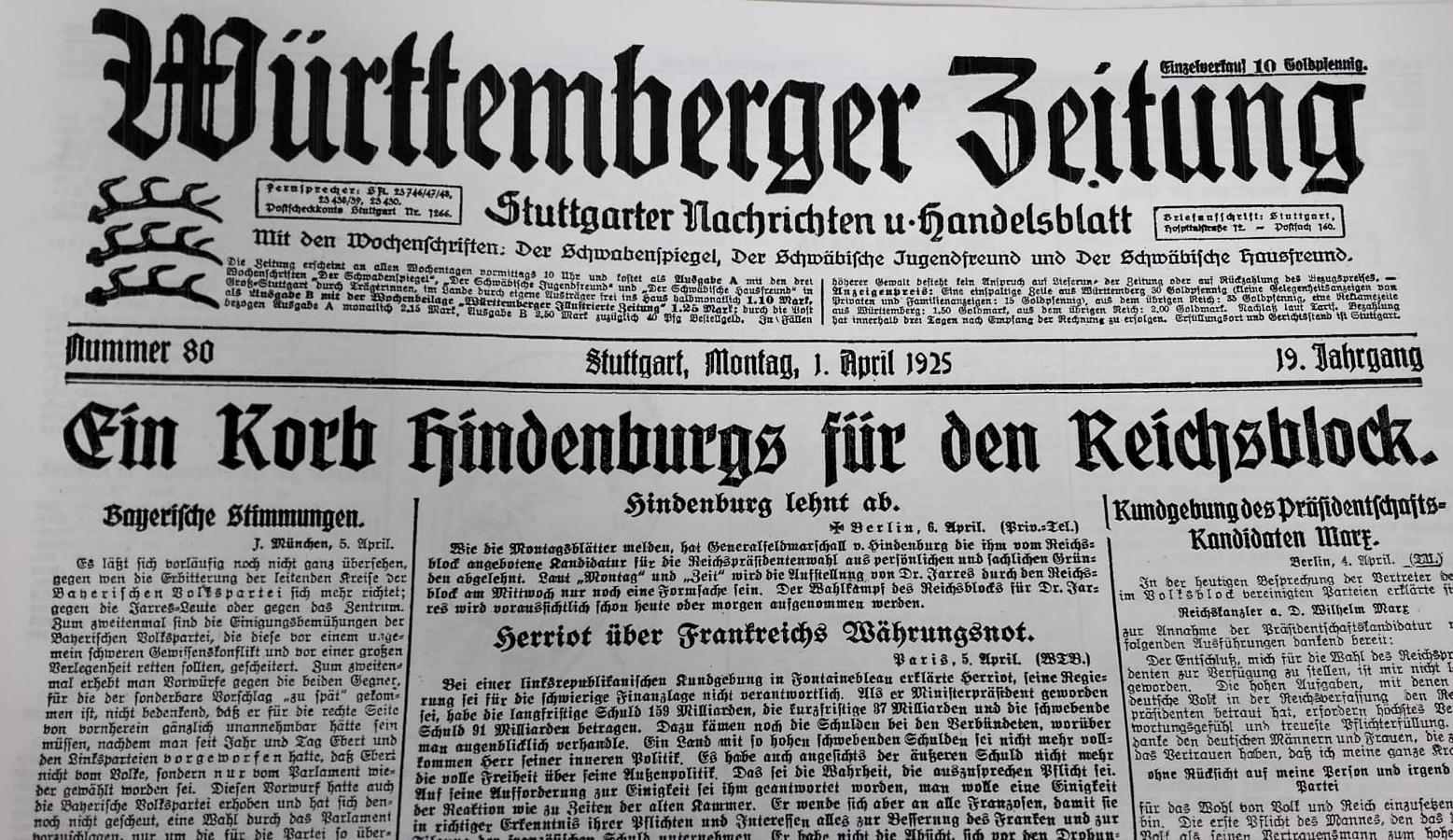 Württemberger Zeitung, 1 апреля 1925г.